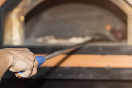 Pizza Chef cleaning pizza oven with special brush. Traditional wood oven in restaurant, Italy. Original neapolitan pizza. Red hot coal