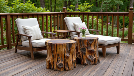 This serene outdoor setting features elegant lounge chairs and unique wooden tables, creating a perfect spot for relaxation amidst lush greenery.