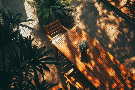 Bask in the serene beauty of sunlight filtering through lush greenery onto a charming wooden patio set. Perfect for peaceful moments in nature. Generated A.I.