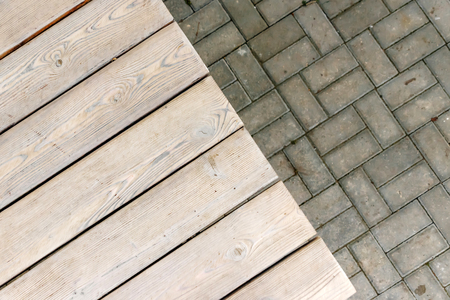 An outdoor cafe setting features wooden tables and chairs. The composition highlights the natural wood tones against a backdrop of city buildings under a daytime sky. The scene suggests a relaxed atmosphere, suitable for commercial projects, editorial content, and various design applications.