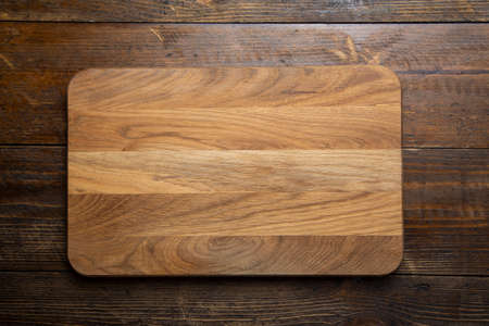 An empty, clean cutting board with a beautiful texture on a dark wooden table. Top view