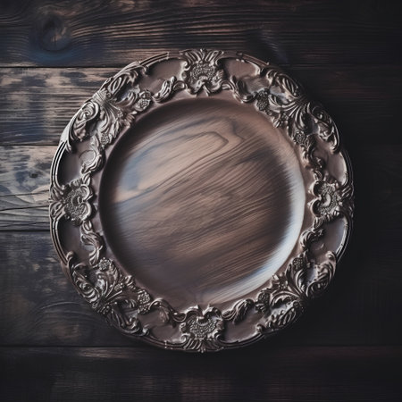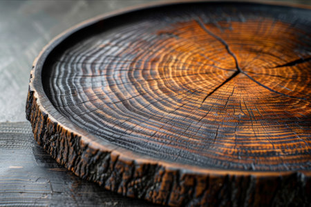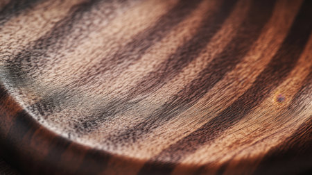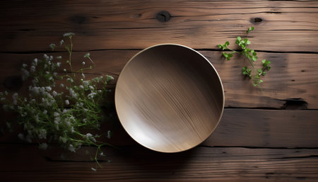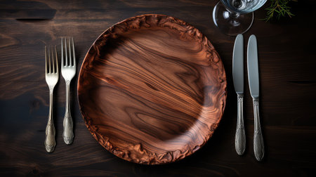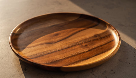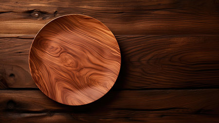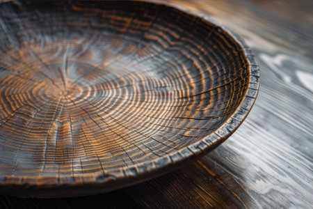 Close-up view of a handcrafted timber plate, with a focus on its rustic texture and hand-finished charm.. AI generated.