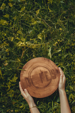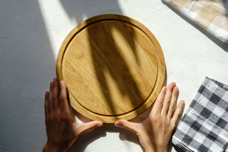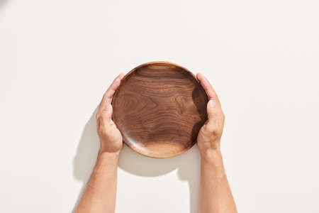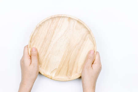 Woman hands holding empty wooden plate on white background