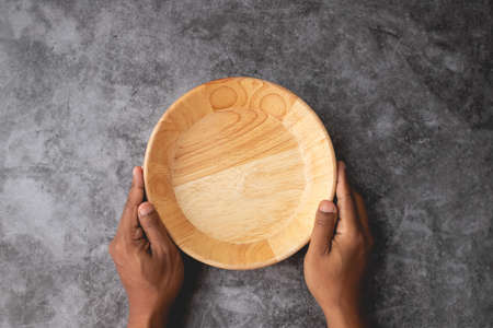 human hand hold empty wooden plate on dark cement wall texture background.