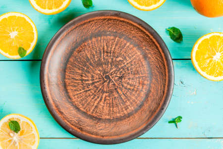 Background. Blue wooden table with oranges halves, spread out in the form of a round clay plate, top view, copy space