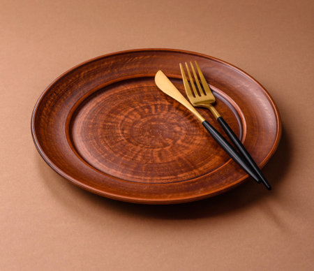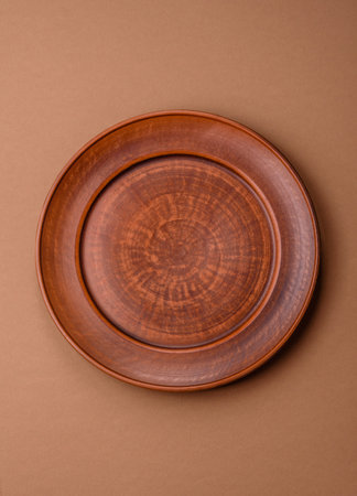 Top view of an empty plate in light brown colors on a wooden table. Elegant template with copy space