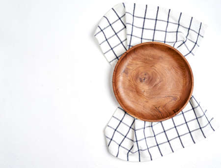 Empty wooden plate isolated on white background. Top view, flat lay.