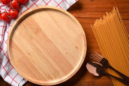 Wood dining table top view with spaghetti ingredients, raw spaghetti, fresh tomatoes, silverware and empty space on round wooden plate.
