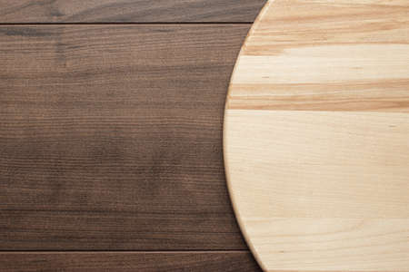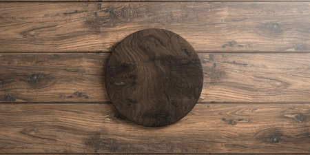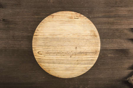 A high angle shot of a round light brown wooden board put on a dark brown wooden surface