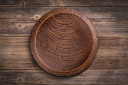 Empty wooden plate on a dark wooden background. View from above.