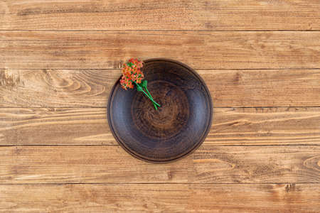 Wooden plate and flowers on a wooden background. Top view.
