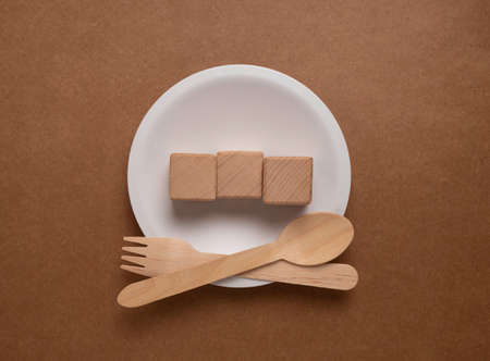 Wooden spoon and fork on a white plate with wooden cubes.