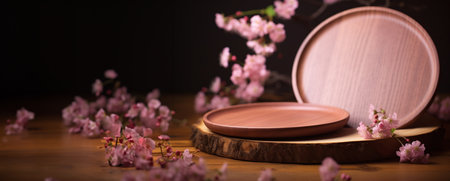 Wooden plate with pink cherry blossoms on a wooden table.