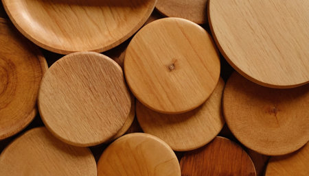 offers a detailed close-up of several light brown wooden circles. The focus is on the distinct wood grain patterns and natural textures visible on each piece. The circular shapes are arranged in a way that highlights their organic form and the subtle variations in color and finish. Some pieces appear smooth and polished, while others retain a more raw, natural feel.