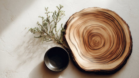 Captivating natural wooden slice showcasing intricate grain patterns alongside a rustic bowl and a delicate green plant, creating a serene and inviting atmosphere.