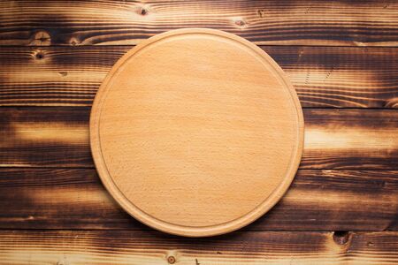 top view of wooden round board for pizza on brown table