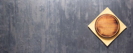 Empty wooden plate on gray cement table background, banner with copy space, Blank wood tray for food display montage, template, mock up, top view, flat lay