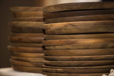 Wooden plate on the table in a coffee shop, stock photo