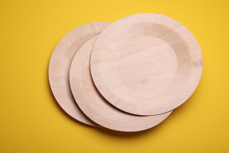 Eco wooden plates on yellow background
