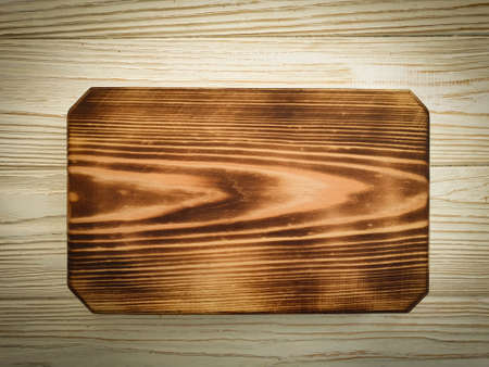 Empty rectangular cutting board on a wooden table. Space for text. Top view.