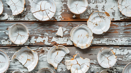Shards of a broken plates on the wooden floor. Broken white ceramic plate on the wooden floor. Broken dishes. Top view of a damaged ceramic plate.