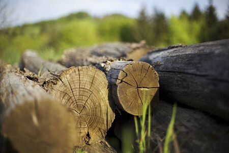 Closeup of logs of trees in nature. a lot of cutted logs.