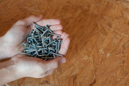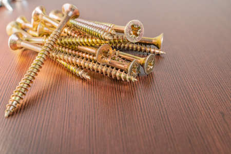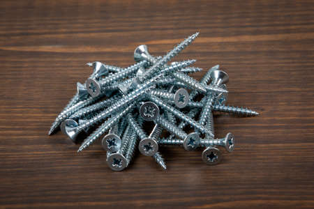 Close-up on screws, metal screws, iron screws, wood screws on wooden board