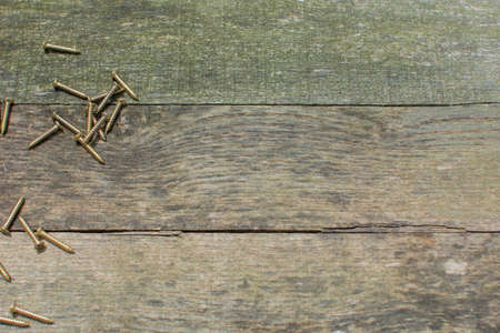 Weathered pallet wood boards as a background with brass wood screws on the left side.