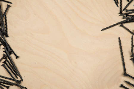 Screws of different shapes at the top and on the side of a free space on a wooden background. top view with space for text.