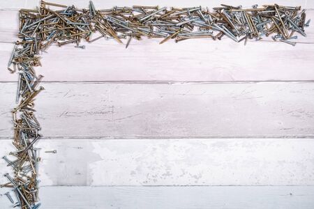 Metal tapping screws for wood on white wooden background. Construction equipment concept. Top view. Copy, empty space for text.