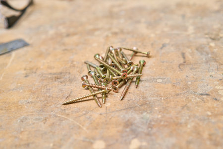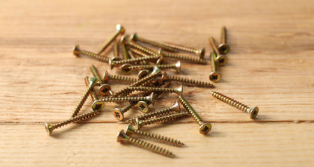 A detailed view of several wood screws scattered on a wooden table, illustrating tools used in carpentry and woodworking projects, highlighting craftsmanship and attention to detail.