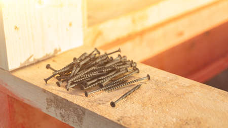 Pile of screws on wooden board at construction site closeup. Fastening supplies for plank connections. woodwork materials and tools. industrial product
