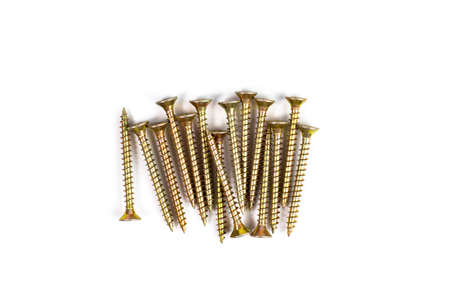 Pile of yellow metal screws on white isolated, top view, copy space.