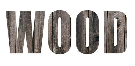 Wood inscription on the background of wooden boards. Isolated text on white background
