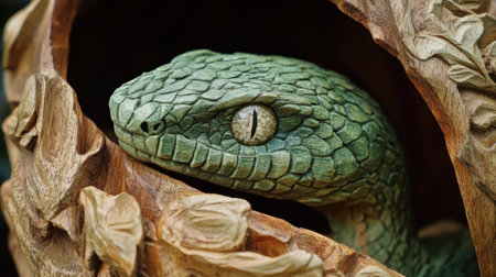 Highly detailed green wooden snake with a natural appearance.