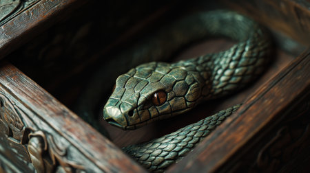 Green serpent emerging from a beautifully carved wooden box.