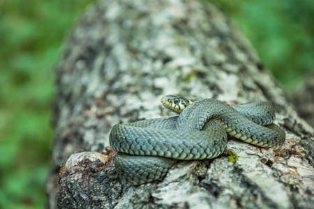 Single coiled grass snake lying on a tree trunk