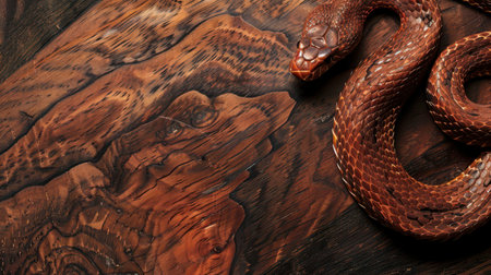 A brown snake is coiled on a dark wooden surface. The snake's scales are visible, and its head is facing the left side of the frame. The snake is in focus, and the background is blurred. The snake's body is a deep red-brown color, contrasting with the dark wood.