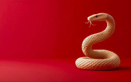 Happy Chinese New Year 2025. Wood Chinese snake over vibrant red background for card design. Chinese zodiac lunar calendar animal. Year of the snake.
