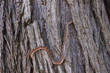 small snake crawling on the bark of a tree