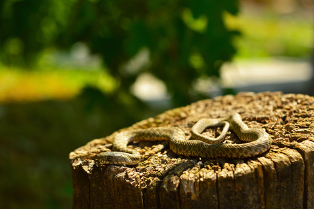 Grey snake resting on the old stump