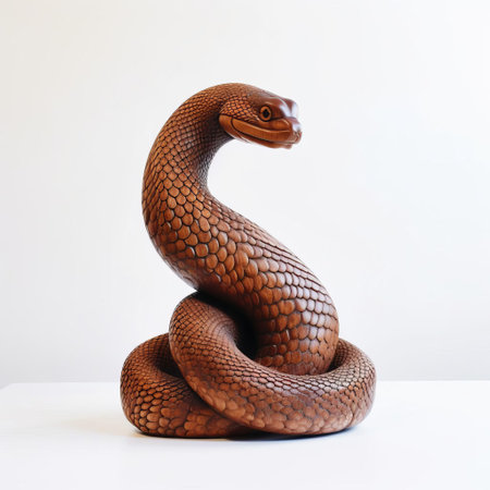 the wooden snake, meticulously handcrafted with precision, lies elegantly on a pristine white background, showcasing its intricate details and lifelike curves, perfect for nature-inspired home decor or as a unique gift for reptile enthusiasts, highlighting the beauty of handmade wooden art and craftsmanship. ai generated