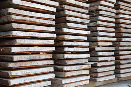 Stacked wooden carpentry boards from natural wood in a woodworking industry.