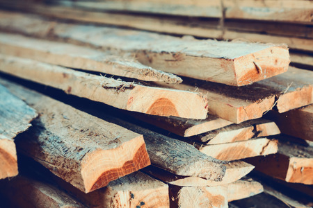 Close up on stack of rough sawn timber pine lumber planks construction material