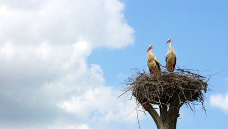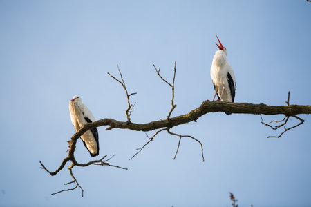 Two adult storks sitting on the bare branch of a tree against a blue sky