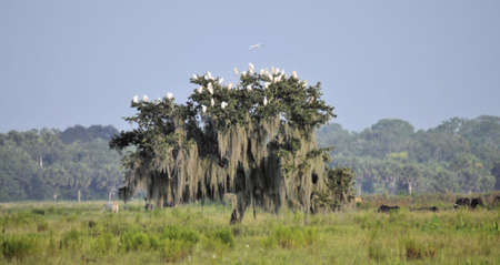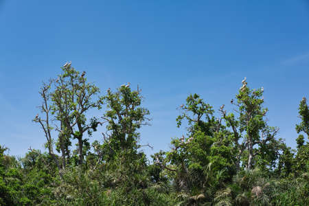 large group of cattle egrets with nests in a tree, birds nesting in a tree, bird breeding season in spring