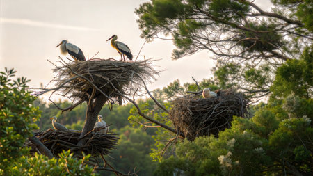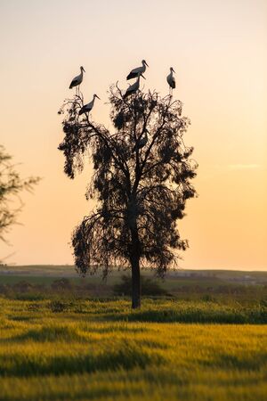 White storks (Ciconia ciconia) in a tree crown at the sunset