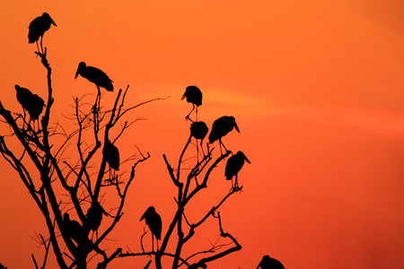Silhouette of many asian open billed stork birds on a treetop with Colorful background