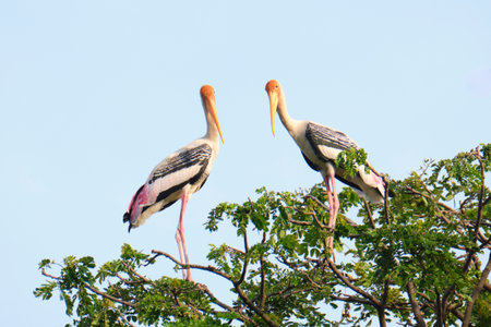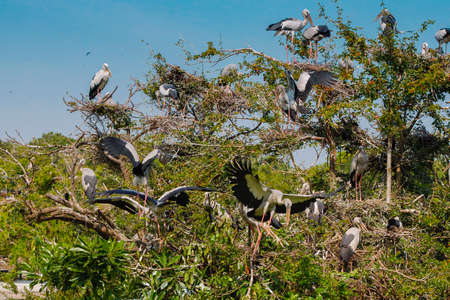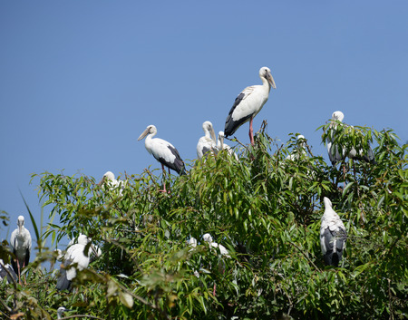 A flock of open billed stork bird perch and winged at the tree on blue sky and white cloud background. A lot of black and white color of Asian openbill bird on the green tree.