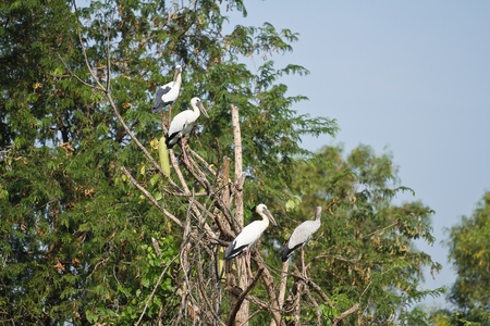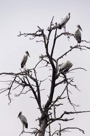 Flock of Open-billed stork, or Asian openbill birds on tree in the public park. The Asian openbill or Asian openbill stork (Anastomus oscitans) is a large wading bird in the stork family Ciconiidae.